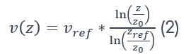 Dabei erfolgt die Interpolation der gewünschten Höhe aus den Werten einer Referenzgeschwindigkeit (vref) in einer Referenzhöhe (zref). Für die Berechnung wird zusätzlich die Rauhigkeitslänge (Oberflächenrauhigkeit, z0) der Umgebung benötigt (Abbildung 1). Die Oberflächenrauigkeit beschreibt die Veränderung der Windgeschwindigkeit in Abhängigkeit von der Haftreibung in Bodennähe (5).
